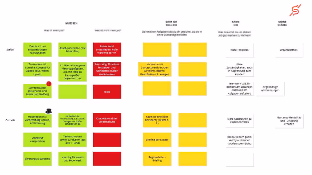 - Grün: Die „Das ist doch sowieso klar“-Sachen sind nicht überflüssig. Nicht jede:r im Team weiß diese Dinge von jeder:jedem. Also schreiben Sie sie auf.