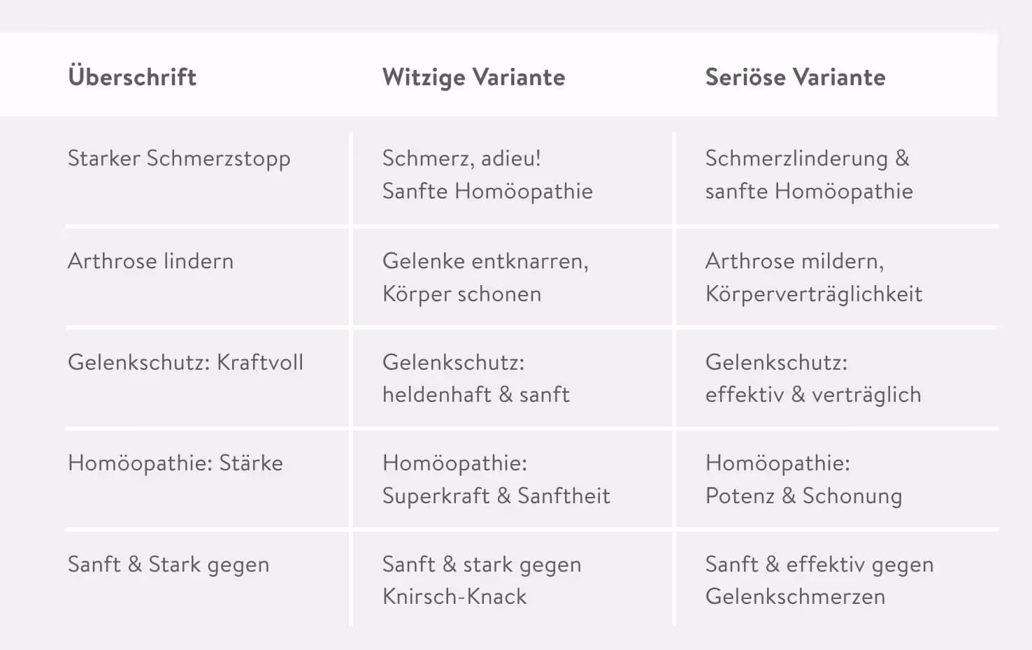 Schreibe mir 5 verschiedene Varianten der Überschrift einer Anzeige für ein homöopathisches Präparat, das gut gegen Schmerz in Gelenken wirkt, besonders bei Verschleißkrankheiten. Es bekämpft speziell Arthrose, ist gut verträglich und individuell dosierbar, weil in Tropfenform einzunehmen. Schreibe die Ergebnisse in eine Tabelle mit zwei Zusatzvarianten „witzig“ und „seriös“.